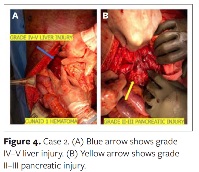A 30-year-old male with type 1 diabetes mellitus presented with multiple blunt traumatic injuries (grade IV to V Couinaud segment 1 liver injury, grade III pancreatic head injury, grade III splenic laceration, grade II right renal laceration, and zone I retroperitoneal peripancreatic and periduodenal hematoma, as well as open facial fractures, a right open patella fracture [Gustilo-Anderson type II], and left open great toe fracture [Gustilo-Anderson type III]) following a motor vehicle accident and was taken emergently to the OR.21-26 The patient required multiple abdominal surgical procedures to repair and control the complex liver injury (Figure 4). Despite extensive perihepatic and endoluminal drainage, the patient developed a midline abdominal incision dehiscence as a result of biliary digestion of the underlying abdominal wall fascia. The patient also manifested a delayed, midjejunal enteroatmospheric fistula with an output of 1000 mL per day. The fistula was controlled as illustrated in Figure 5.
