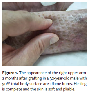 Mortality from severe burns in the early stages of treatment has decreased substantially owing to increased knowledge of burn pathophysiology and of fluid and electrolyte balance, as well as to improvements in intensive care, burn treatment modalities, infection control, and nutritional support. This has led to a growing number of survivors requiring skin grafting procedures.1 However, limited donor site availability remains a challenge for achieving rapid closure of burn wounds. Various skin grafting techniques, such as Meek micrografting and meshed grafting, have been developed to allow skin graft expansion to cope with restricted donor site availability.2