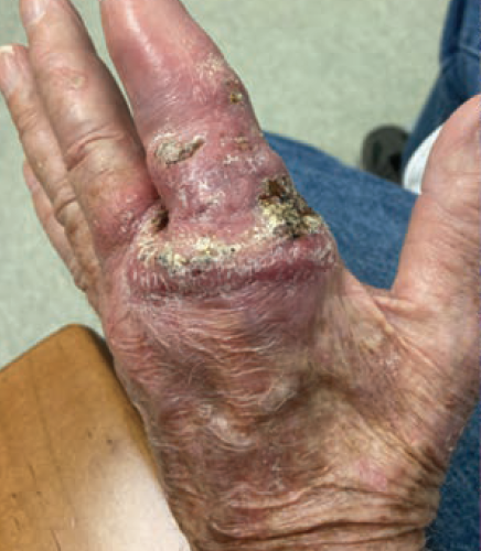 A 78-year-old male originally presented to a dermatology office for a nonhealing ulcer on his left hand (Figure 2). Three months prior, he had sustained an abrasion to the left index finger and developed a persistent ulceration at this site. Surface cultures of the wound grew streptococcal species and Escherichia coli. He was treated with ciprofloxacin, silver sulfadiazine cream, and Epsom salt baths, and followed up with wound care. Three months later, he was referred to an orthopedist due to decreased mobility of the index finger. The lesion appeared as a large ulcer over the second MCP joint on the left hand, with purulent, bloody, malodorous discharge. He had palpable axillary lymph nodes on exam. The orthopedist was concerned for possible neoplasm and obtained a tissue biopsy, which revealed SCC. A recommendation was made to amputate the second and third digits, but the patient sought a second opinion with a dermatologist. The lesion was deemed too large for Mohs surgery and ultimately the patient was treated with systemic immunotherapy. He received cemiplimab, which resulted in dramatic shrinkage of the tumor at the fifth of 8 cycles; as of the time of writing, the tumor continued to improve.