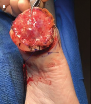 The foot accounts for approximately 3% to 15% of all reported cases of cutaneous melanoma.1,2 Malignancies of the foot are relatively rare and pose a difficult problem for clinicians, with malignant melanoma in this area associated with poor prognosis.1,3 The foot has unique anatomy for weight bearing, and preserving this distinctive role is imperative to patient function after any intervention. To surgically resect a melanoma lesion on the foot, smaller-than-recommended margins of soft tissue are taken to avoid amputation and preserve function compared with other areas of the body. However, the use of smaller margins increases the risk for recurrence and healing complications. Additionally, because in the foot there is little soft tissue over deep structures, large deficits with exposed deep structures are at risk with any surgical resection of lesions of the foot.