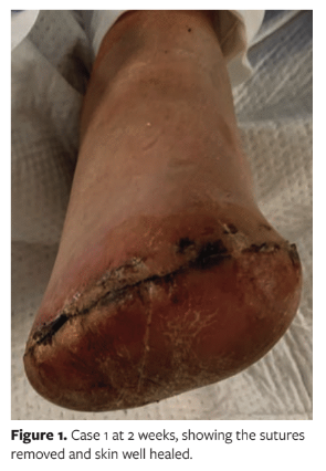 Patient demographics and wound characteristics are detailed in the Table. Five of the 8 limbs managed with TMA and the Allgöwer-Donati suture technique healed uneventfully (62.5%), with an average time to healing of 3.3 weeks. One limb (12.5%) required local wound care after dehiscence but went on to heal at 4 weeks. One limb (12.5%) did not heal and required revision proximal amputation. One limb (12.5%) required local wound care and was lost to follow-up.