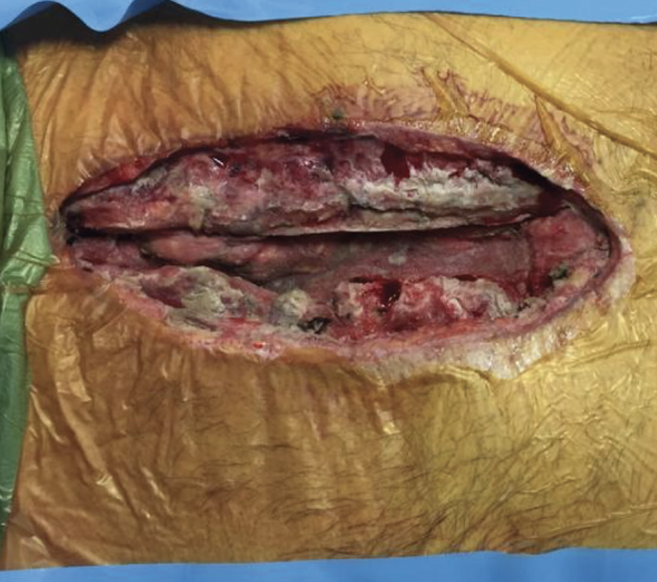According to the protocol of the authors of the present case study, the vacuum-assisted wound closure dressing was changed every 5 days. Irrigation with 100% saline solution was started 12 hours before each surgical revision, and new tissue and culture samples were collected at each dressing change.