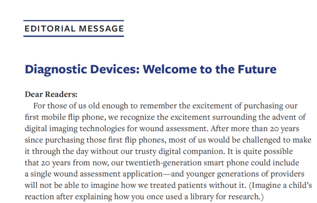 For those of us old enough to remember the excitement of purchasing our first mobile flip phone, we recognize the excitement surrounding the advent of digital imaging technologies for wound assessment. After more than 20 years since purchasing those first flip phones, most of us would be challenged to make it through the day without our trusty digital companion. It is quite possible that 20 years from now, our twentieth-generation smart phone could include a single wound assessment application—and younger generations of providers will not be able to imagine how we treated patients without it. (Imagine a child’s reaction after explaining how you once used a library for research.)