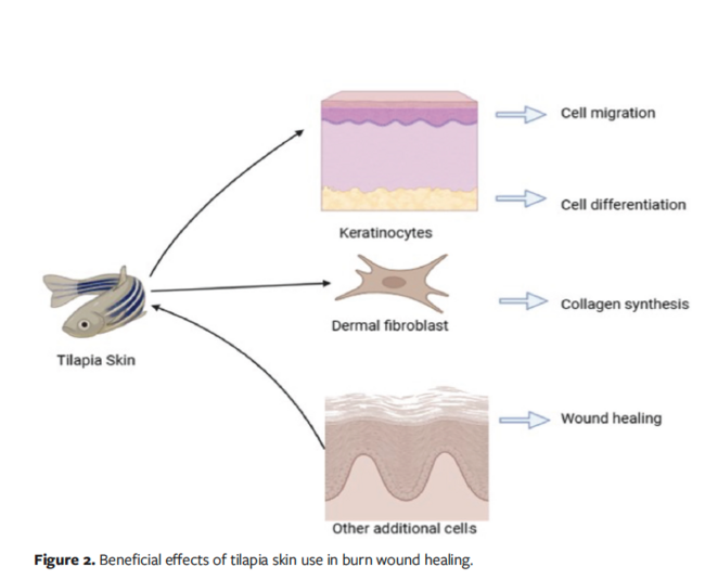 spectrum antibacterial cream, is the standard in the treatment of burns and promotes reepithelialization.62 In a phase 2 randomized controlled trial, silver sulfadiazine was used in the management of SPTB and DPTB.63 The total reepithelialization time for SPTB and DPTB after treatment with silver sulfadiazine was approximately 10 days to 11 days, and 21 days, respectively. In the same study, treatment with Nile tilapia skin achieved complete reepithelialization in a shorter period of time, with an average of 1.43 days less for outpatients and 1.14 days less for inpatients compared with the standard treatment group.63 In addition to reduced reepithelialization time, accelerated wound healing and a 42.1% reduction in total cost per patient were observed in a phase 3 trial involving patients with SPTB, which suggests that it is a viable alternative to conventional treatment.50 Overall, AFS is a novel and potential therapeutic option in the management of burn wounds and offers multiple advantages over conventional methods. The effects of tilapia fish skin on burn wound healing are shown in Figure 2.