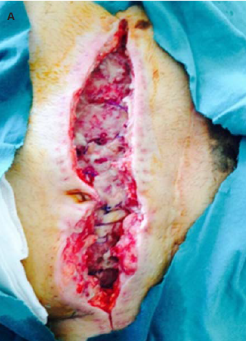 NPWT was applied following thorough surgical debridement and wound bed preparation. All wounds were irrigated with sterile saline until viable tissue margins were achieved. Therapy was initiated only after local infection control was established, in line with manufacturer recommendations and clinical wound care protocols. NPWT was not applied in cases of uncontrolled or spreading infection.The Comfort NPWT system (Konfort Özel Sağlık Hizmetleri Tıbbi Malz San ve Tic Ltd Şti) was used with continuous negative pressure of −75 mm Hg. The first dressing change was performed on postoperative day 3, followed by changes every 5 days. Figures 2A and 2B illustrate the application process in accordance with the institutional protocol.