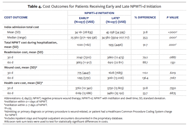 In the current study, initiating NPWTi-d as the first type of NPWT or within 1 day of NPWT was associated with significant improvements in patient outcomes and reductions in cost. Patients who received early initiation of NPWTi-d spent fewer days on NPWT and had a shorter hospital LOS compared with patients who received late initiation of NPWTi-d, resulting in an average reduction in care costs of over $10 000. Early initiation of NPWTi-d was also associated with a significant reduction in total debridements (P =.0221), trips to the OR during hospitalization (P =.0002), trips to the OR while receiving NPWT (P <.0001), number of days to the final OR procedure (P =.0008), and wound-related readmissions (within 30 days [P =.0130], within 60 days [P =.0293]).