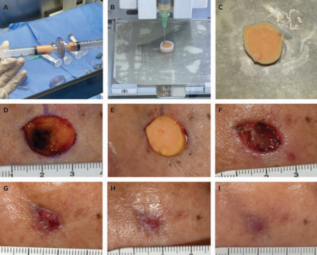 Adipose tissue extracted from the lower abdomen through liposuction was mechanically micronized in descending order of particle size using a micronizer filter (Adinizer; BSLrest). The resulting MAT was mixed with saline after being collected into a syringe. The mixture was then gently agitated with normal saline to initiate a washing and purification process. The MAT solution was prepared and separated into distinct layers through the vertical arrangement of syringes, resulting in concentrated MAT. This solution was then transferred to new syringes as bio-ink for the 3D bioprinter. The bioprinter first created a scaffold with polycaprolactone based on wound dimensions, after which dispenser deposited MAT bio-ink into the scaffold. This process occurred in a temperature-controlled setting and took approximately 10 minutes.