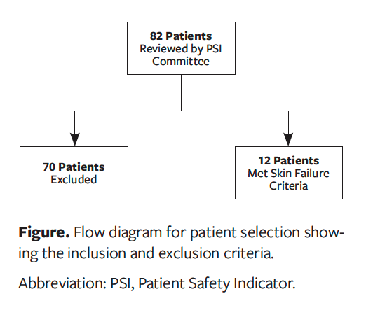 During the study period, 82 charts were reviewed by a PSI committee. Of these, 12 patients were found to meet the Hill and Petersen criteria for skin failure (Figure). These 12 patients were in the ICU due to critical medical illness. Patient ages ranged from 25 years to 79 years, with a mean age of 60.3 years. Eight patients were African American, and 4 were White. Race and sex were obtained from the patients’ EMR, which was recorded on admission and either self-reported or reported by a family member or equivalent legally authorized representative. The LOS ranged from 28 days to 136 days, with a mean LOS of 58 days. Eleven of the 12 patients were male, and 1 was female. Four of the 12 patients were discharged to the next level of care, and 8 patients died. Of the 12 patients, 3 were cared for by surgical services (trauma), 6 were under the cardiovascular service, and 2 were managed by an inpatient medical team.