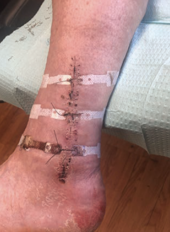 The postoperative treatment regimen was outlined by the same 2 senior surgeons (A.K. and E.H.). Patients were allowed to begin non-weightbearing ankle range-of-motion exercises at 1 week postoperative. Sutures or staples for skin closure were removed at 2 weeks postoperative in patients without diabetes (Figure 3) and 3 weeks postoperative in patients with diabetes. Patients were allowed to begin partial weightbearing in a removable walking boot at this time, if deemed clinically appropriate. If concern existed that starting partial weightbearing may precipitate potential complications, this was delayed. The DAC device was removed at 4 weeks postoperative. Removal of the DAC occurred once the incision was fully healed or one of the 2 senior surgeons deemed that the device was no longer providing additional support, ie, was loose or non-functioning.