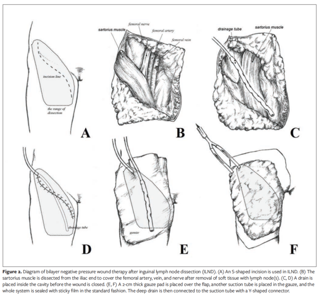 Although the previous study showed that bilayer NPWT can be safely applied in refractory postmastectomy seroma21 and after great saphenous veins harvesting for coronary artery bypass graft,22 it is unclear whether it is safe to apply this therapy to flaps in ILND. The inguinal lymph node dissection, also known as the groin dissection, was devised by Basset in 191223 and variations have been developed by surgeons from different countries, including expansion of the scope of surgery,35 modification of the surgical incision,36,37 and robotic surgery.38