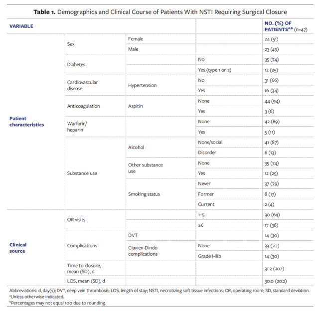 The primary objective of this study is to describe the sociodemographic factors of and time to closure for patients who required surgical wound closure owing to an NSTI. The secondary objective is to identify possible predictors of time to closure.