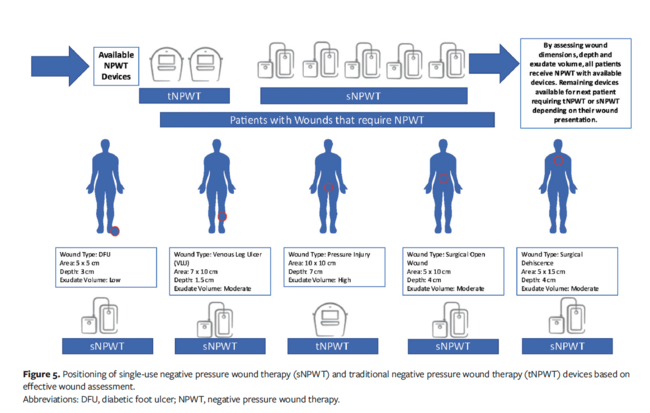 Resources are finite within health care systems. These systems do not have an unending supply of NPWT devices, which is another reason choice of NPWT device is important; a clinician does not want to be in a position in which a patient needs NPWT and there are no available devices. For example, if only 1 tNPWT device were available, but sNPWT devices were readily available and 5 patients presented with open wounds, how does the clinician choose who receives tNPWT? What would happen if a sixth patient presented with a deep, heavily exuding wound? Therefore, by assessing the wounds for NPWT device, a choice does not have to be made. Effective wound assessment enables tNPWT and sNPWT modes to be prescribed to the appropriate patients with the most suitable wounds, thus enabling effective treatment for all. Figure 5 provides a detailed explanation of NPWT device positioning and how this can be effectively put into place within a health care setting to ensure resources are used efficiently. Logistically, therefore, a patient with a low- to moderate-exuding wound (<400 cm2) can benefit from an sNPWT device that may offer more patient convenience, whereas a patient with a very deep (>4.5 cm) and heavily exuding wound would require tNPWT.