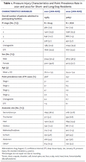 In general, to be eligible for inclusion in the study a patient's wound evaluation data must have fulfilled the following criteria: (1) any stage PI identified on admission or from either short- or long-term stay residents according to the NPIAP; (2) PI must have been assessed using the technology at the participating facilities and included in the database during the study period, and (3) PI evaluation data included in the comparison analysis collected between January 1, 2021, and August 31, 2021 (2021 data) or between January 1, 2022, and August 31, 2022 (2022 data).