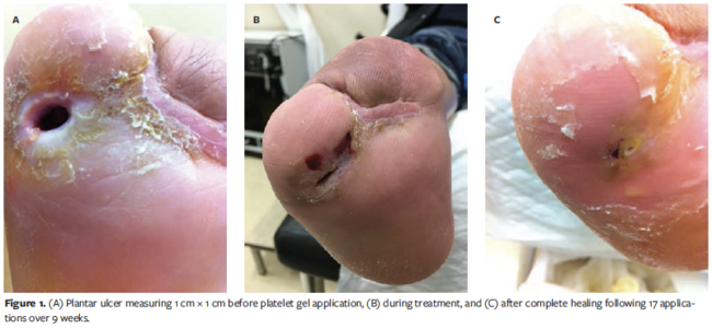 In 2018, an observational study of patients with diabetic foot ulcers treated with PG over 45 months at Centro Hospitalar Universitário do Porto, Porto, Portugal, was published.14 Patients were treated with homologous PG obtained from blood donations. Patient comorbidities, number and time of treatment, and outcomes were evaluated. PG appeared to be an effective therapeutic alternative for chronic ulcers, provided compliance and effective metabolic control were ensured.14
