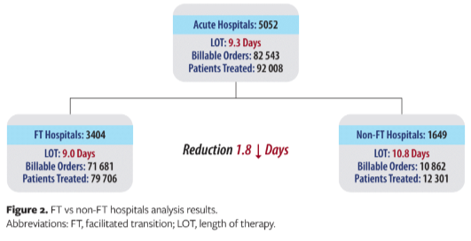 This study compares LOT between patients discharged from hospitals with FT discharge programs providing NPWT to patients at/before discharge versus those without (non-FT). FT facilities were further segmented: active-FT (≥1 transition order during past 90 days) versus inactive-FT (FT set up but no orders during past 90 days). There were 82 543 billable orders and 92 008 patients analyzed. LOT was 1.8 days shorter for FT versus non-FT facilities (potential per-patient savings of $5071 for FT facilities). LOT was 1.2 days shorter in active-FT versus inactive-FT facilities. This study shows shorter stays and LOT for patients in facilities actively using FT.