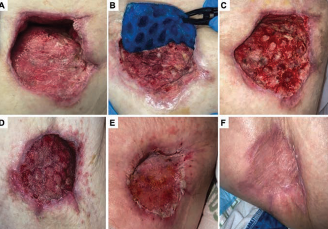 A 23-year-old male presented with a deep infected soft tissue wound originating from an injection site. Systemic antibiotics were initiated. NPWTi-d was used for 22 days, until the wound was covered with healthy granulation tissue. Therapy was switched to traditional NPWT for 1 week, after which a split-thickness skin graft was applied. NPWT was used as a bolster over the skin graft, and graft take was 100% (Figure 2).