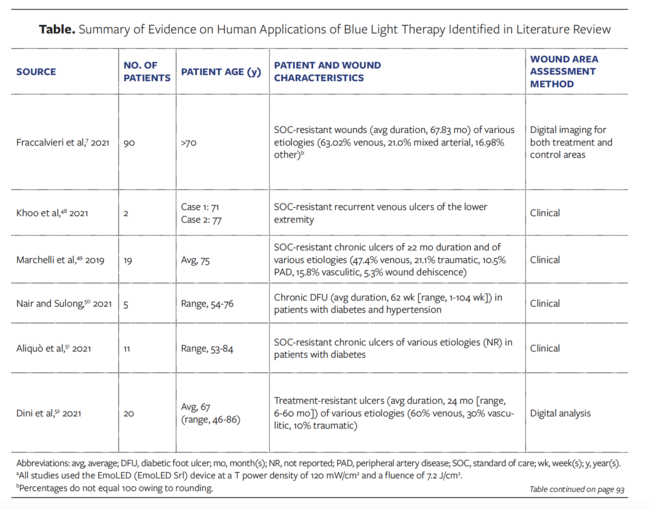 7. Fraccalvieri M, Amadeo G, Bortolotti P, et al. Effectiveness of blue light photobiomodulation therapy in the treatment of chronic wounds. Results of the blue light for ulcer reduction (B.L.U.R.) study. Ital J Dermatol Venerol. 2021;157(2):187-194. doi:10.23736/S2784-8671.21.07067-5