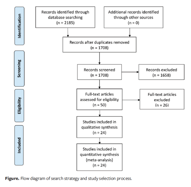 The literature search of databases yielded 1708 unique records. After title and abstract screening, 50 articles were retrieved and screened for eligibility. Of these, 24 studies were included in the meta-analysis. The study selection process is shown in the PRISMA flow diagram (Figure).