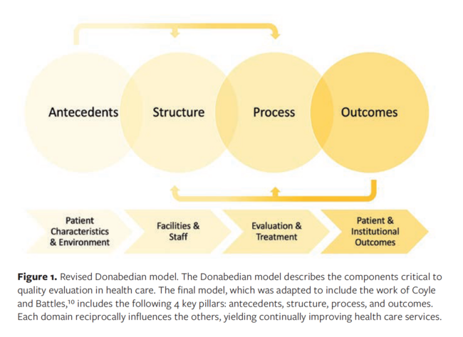 Donabedian10 first described the framework for evaluating quality care in 1966 after identifying limitations of the sole use of outcomes (ie, assessing outcomes without the appropriate context), such as questionable relevance and validity of success. To supplement outcomes, Donabedian10 introduced the concepts of structure, the physical setting and components around which medicine is practiced, and process, the manner in which medicine is practiced. The 3 domains viewed in conjunction would provide a multidimensional approach to identifying shortcomings and difficulties in a given care model.10 Since its inception, the Donabedian framework has been augmented, notably with the addition of pertinent antecedents of care by Coyle and Battles11 in 1999. This domain refers to the influence of a patient’s environment and personal characteristics in assessing outcomes. Figure 110 outlines the Donabedian model currently in wide use for quality assessment.