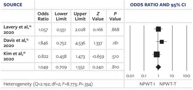 The 3 studies included in the current study were RCTs published in 2020. NPWT-T was considered the control treatment for each study group, with continuous pressure maintained at 125 mm Hg. The NPWT-I intervention varied between each study regarding the solution used and dwell time. Kim et al16 used 0.1% polyhexanide plus 0.1% betaine solution as an adjunct to NPWT-T, with a 20-minute dwell time followed by 2 hours of NPWT. Lavery et al14 used 0.1% polyhexanide-betaine irrigation (NPWT-I) at 30 mL per hour, and Davis et al15 used 0.9% normal saline infusion at 15 mL per hour. Dressing changes were similar across studies, occurring every 48 to 72 hours. Treatment visits were once weekly for 12 weeks,15 once weekly for 16 weeks,14 or every 3 days for 8 weeks.16