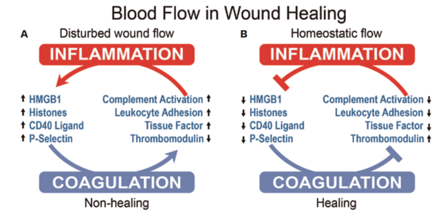 Healing of any wound is dependent upon skin perfusion pressure and blood flow to and PO2 at the wound site; DFU healing mechanisms are not solely dependent on these parameters, however.20-22 A rheologic component of flowing blood is laminar SS. Normal arterial SS (approximately 15 dyne/cm2) from flowing blood affects healing by reducing the duration of inflammatory responses in both direct and downstream blood vessels.