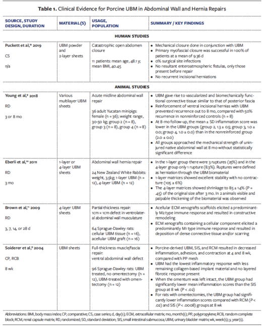 Abdominal repair with UBM has also shown success in various animal models, promoting closure and largely preventing hernia recurrence.9,10 One study compared the performance of single vs. multilayer UBM matrices in abdominal wall repair in rabbits.10 The single-layer UBM demonstrated superior stability, but more recurrent hernias were noted in this group. While the multilayer UBM group had less recurrence, this group demonstrated notable graft shrinkage after 3 months10 (Table 1).