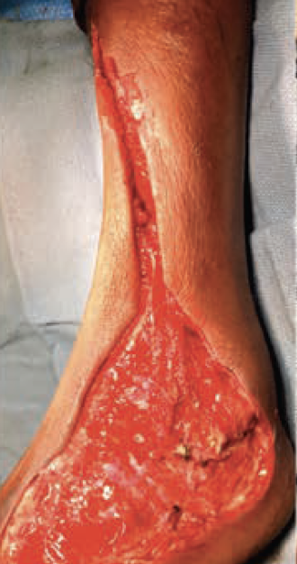 Radiograph and MRI of the leg showed a soft tissue defect with no subcutaneous emphysema and no periosteal reaction of osteomyelitis. The lower extremity ultrasound showed no deep venous thrombosis. The patient was started on intravenous antibiotics and taken for surgical debridement.